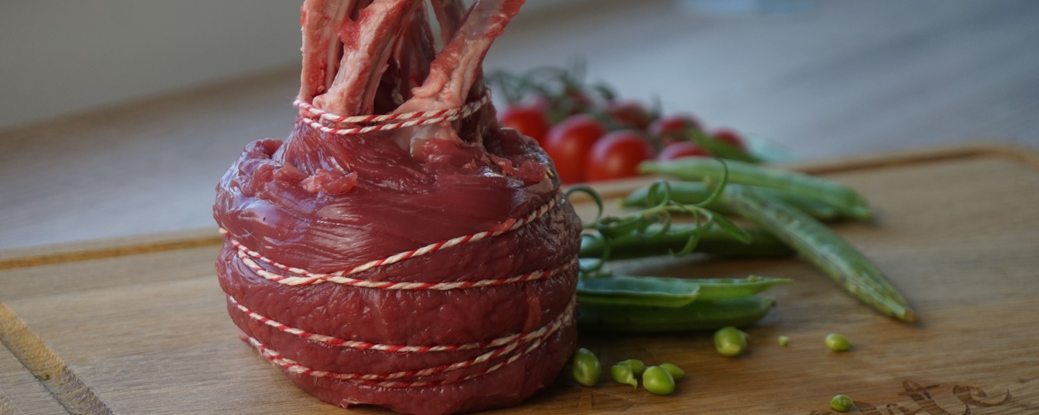 Ihr beginnt damit, das Lammkarree zu parieren, befreit es also von eventuellen Sehnen und Fetten. Dann bindet ihr das Fleisch und die Knochenenden mit Küchengarn zu einer runden, ringförmigen Krone.