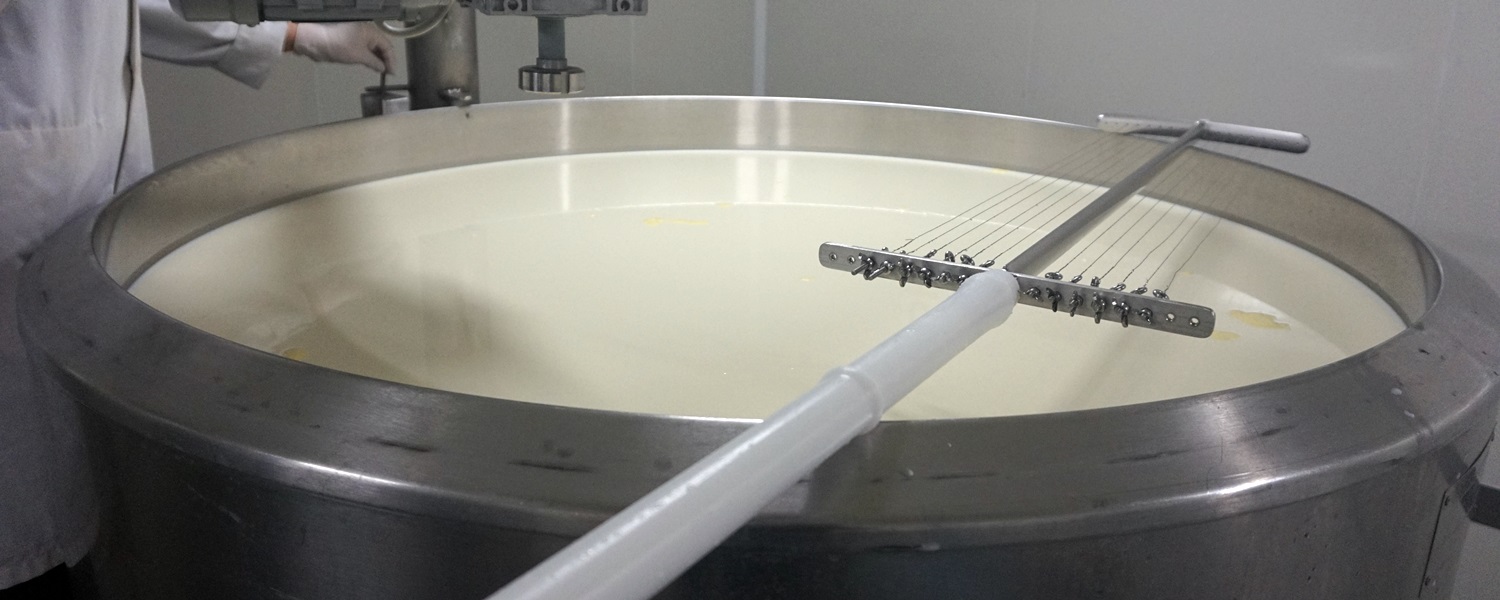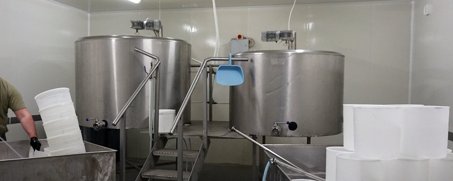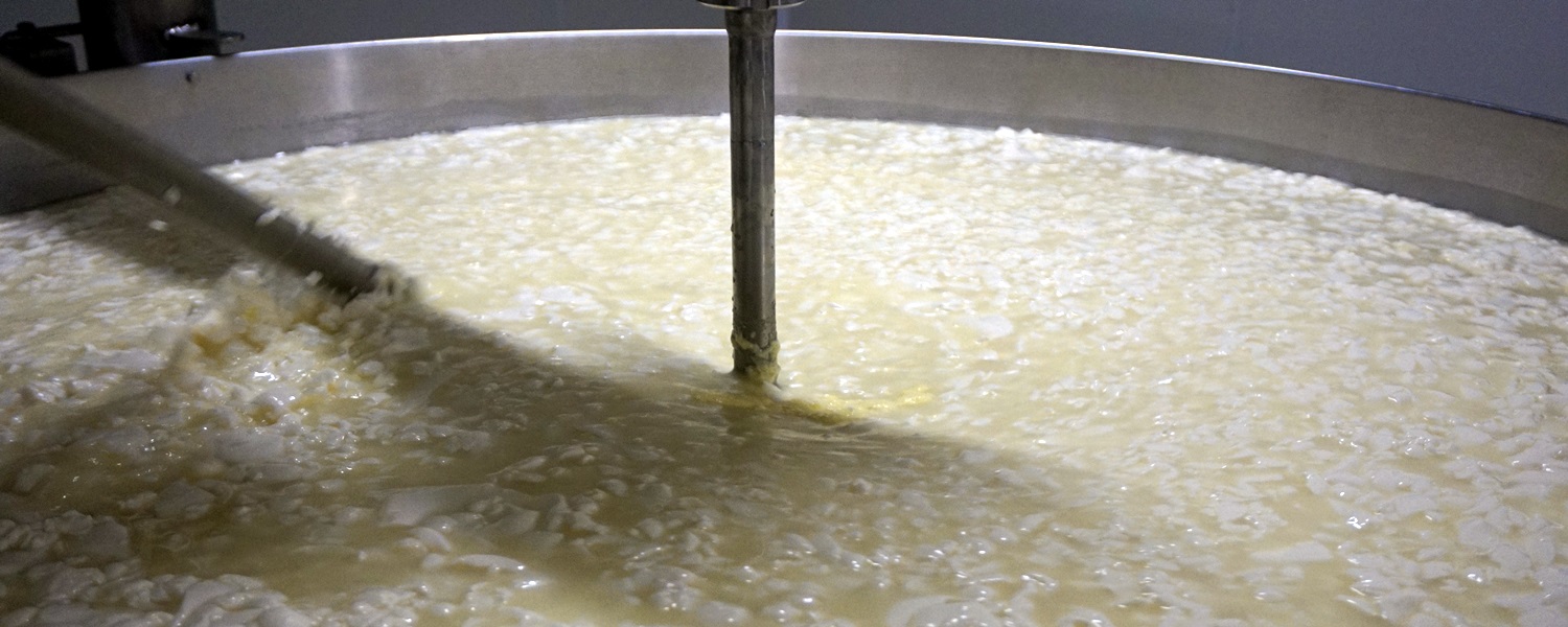 Wir beginnen am sehr frühen Morgen in der Käserei mit dem Befüllen der Tanks. In beiden Tanks werden jeweils 1000 Liter Rohmilch mit Milchsäurebakterien versetzt. Das darauffolgende Erwärmen, das „Dicklegen“ der Milch, spaltet das Eiweiß und führt zur Gerinnung.
