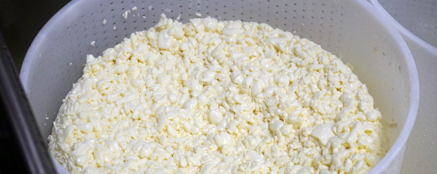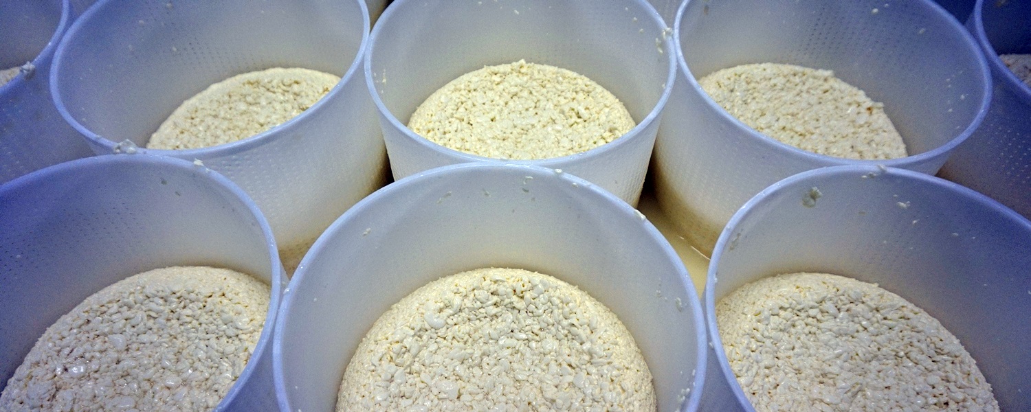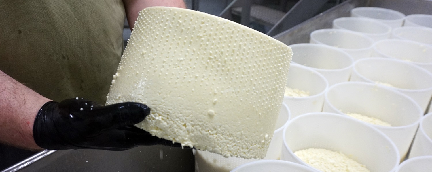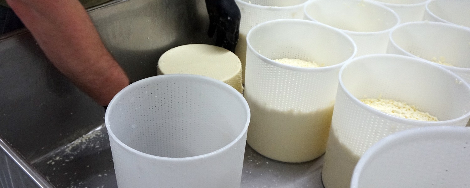 Der daraus entstehende Käsebruch sieht sehr flockig aus und wird in die für die jeweilige Käsesorte typischen Formen gespült.