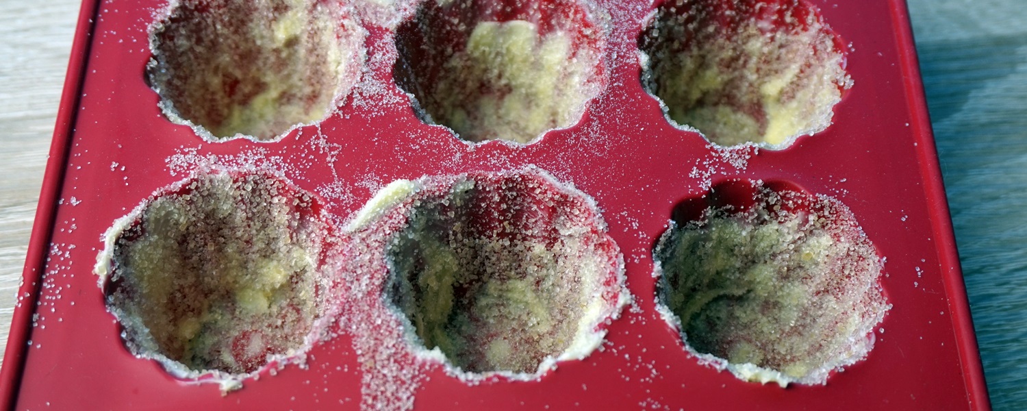 Bevor ihr den Teig in die Silikonform gebt, muss diese mit Butter eingefettet werden. Dann streut ihr den Zucker in die Förmchen und verteilt die Kristalle gleichmäßig durch Schwenken der Form – dies wird später die karamellisierte Kruste.