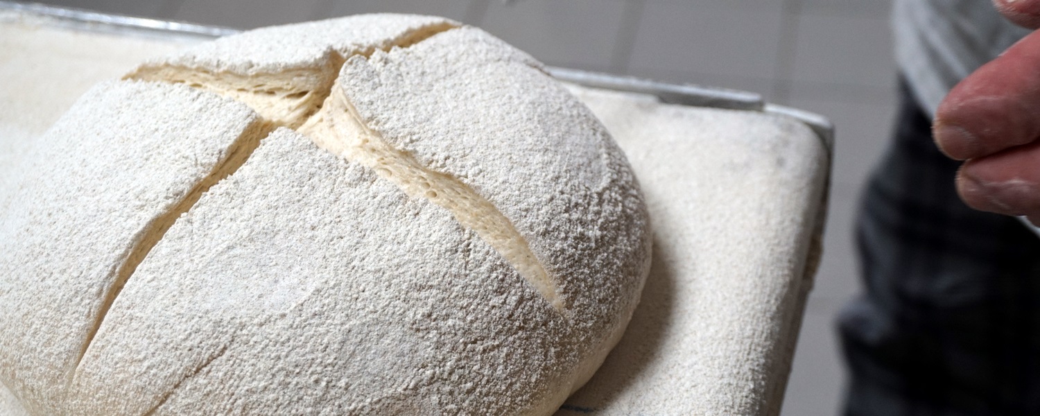 Wir lernen verschiedene Schnitttechniken – und dass diese nicht nur von Region zu Region, sondern auch von Land zu Land unterschiedlich sind! Das Einschneiden beim Brot nennt man Ausbund, und es dient im Kern dazu, dass das Brot beim Ofentrieb nicht unkontrolliert aufreißt. Ein ansehnlicher Ausbund vergrößert die Oberfläche der Kruste, das wirkt sich positiv auf den Geschmack aus!